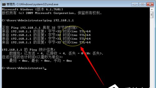 3.在出现的界面中输入“ping 192.168.1.1“并回车,检测电脑跟路由器的连接是否正常。
