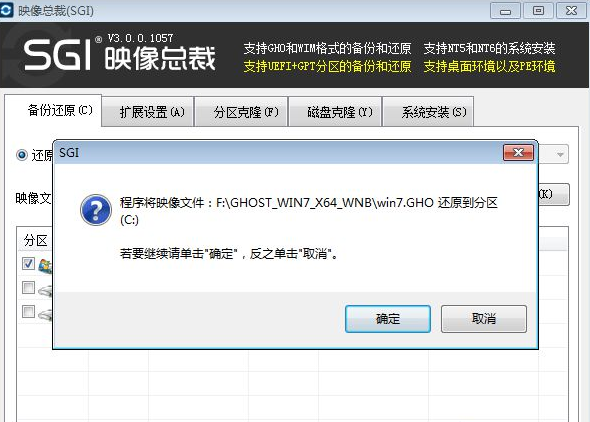 4.在软件界面中选择【还原系统】,映像文件路径选择win7.gho文件,勾选C盘,点击【执行】。