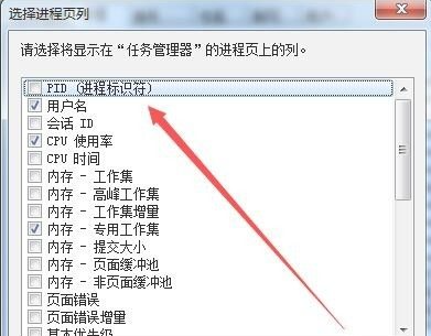 这时会打开选择进程页列窗口,选中最上面的“PID(进程标识符)”前的复选框;