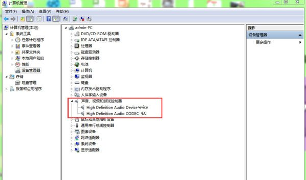 打开计算机——点击管理——点击设备管理器——查看声音、视频和游戏控制器。检查声卡在设备管理器中有没有被禁用(如图)。