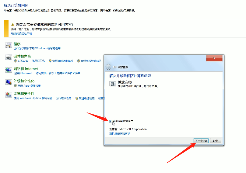 4、弹出播放音窗口,点击高级,勾选自动应用修复程序,下一步