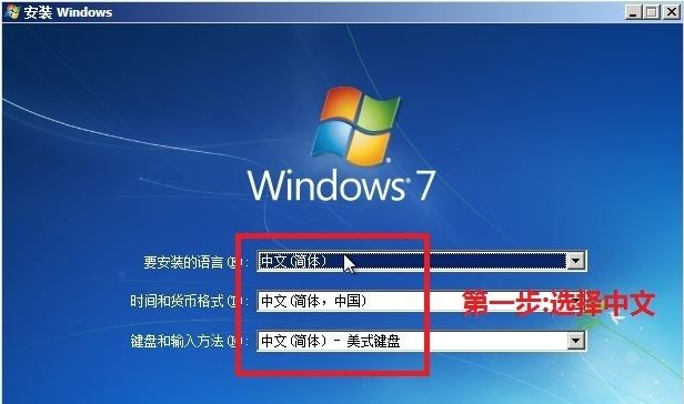 7.接着会出现Windows 7 安装界面,首先依次选择为中文(简体),中文(简体,中国),中文(简体)-美式键盘,选择好了点击下一步。