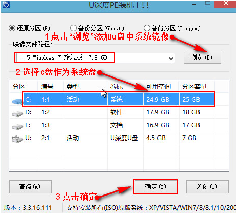 2、然后进入pe后会自启U深度装机工具,点击【浏览】,选择你拷贝在U盘中的win7系统,默认选择C盘安装,点击【确定】。