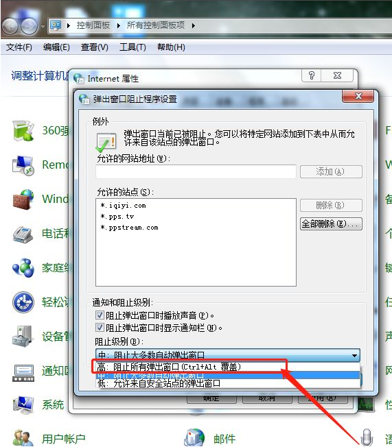 4、点开‘阻止级别’,我们一般设置为踪迹组织级别,你也可以设置高级,高级就是所有的弹窗都禁止。