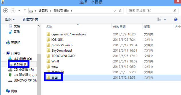 4、之后就会进入到一个“选择一个目标”的窗口页面中,我们只需选择一个新的路径用来放置桌面文件夹即可,选好后我们点击下方的【选择文件夹】。