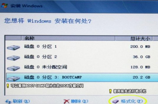 7、这时我们把win7启动盘插到电脑当中,重启系统,进入到安装程序页面,在进行磁盘分区的页面时,选择我们刚刚划分出来的空间,将其【格式化】操作。
