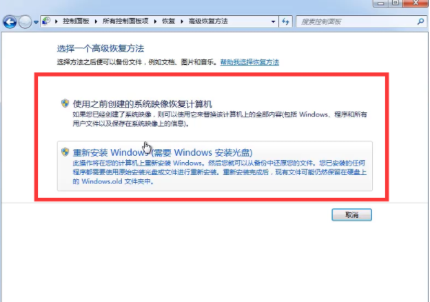 2、如果电脑里有镜像系统或Windows 光盘,我们可以直接点击恢复界面中的“高级恢复方法”,然后任意选择一个恢复方案进行重装系统的方法即可。(这里不重点展开,主要介绍还原的方法)