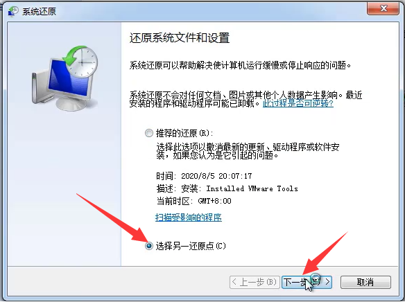 4、来到系统还原窗口,选择另一还原点后点击下一步。