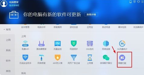 1.首先进入到我们的电脑管家当中,找到【工具箱】,我们在当中选择【拦截弹窗】功能。