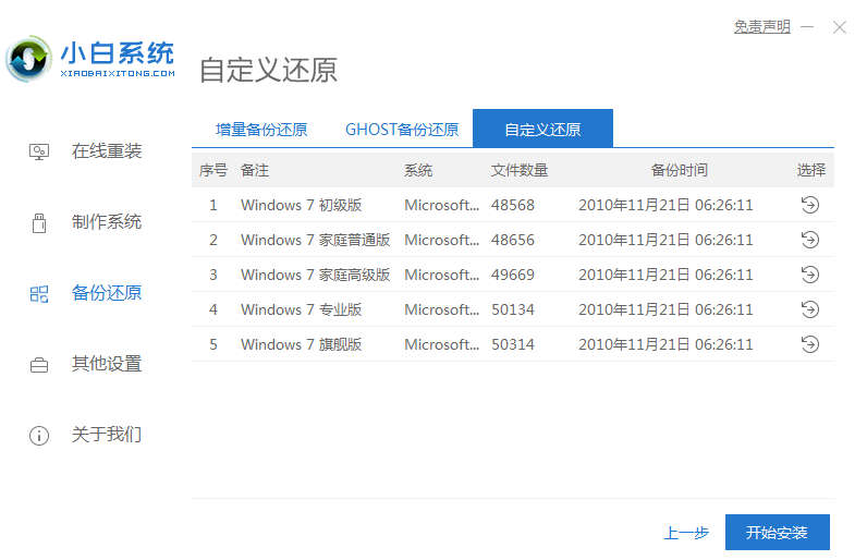 1、下载并打开小白系统软件,点击备份还原——自定义还原,小白会识别出系统文件,识别出来后点击下一步。