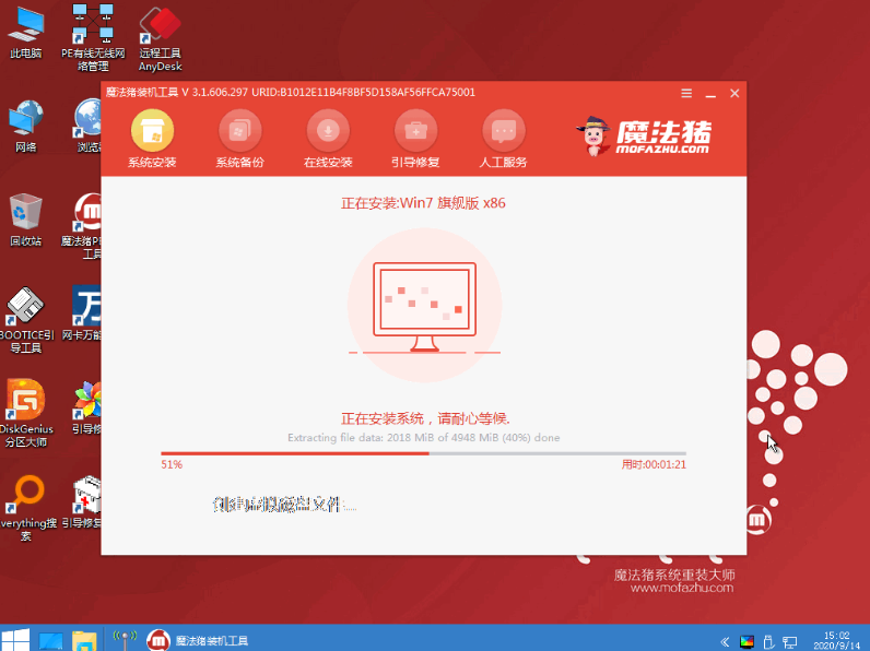 5.进入魔法猪PE系统,魔法猪系统装机大师将自动帮我们安装系统,此时只需耐心等待即可。