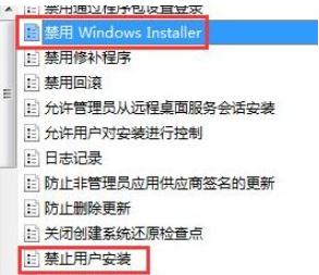 5.在windows installer的右侧,点击”禁用windows installer“和”禁止用户安装“并双击打开,将其设置成关闭即可修复win7系统无法安装软件的问题所在。