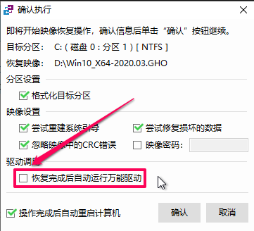 10)在弹出窗口中去掉“驱动调用”勾选,另外的选项保持默认即可“确认”执行。
