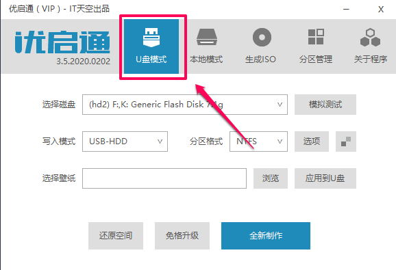 PS:如果之前制作过其它的U盘PE,可以先还原空间之后再全新制作,建议U盘分区格式选择NTFS或exFAT