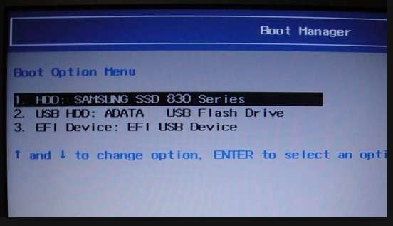 6)看到一个类似下图的界面,这里可以选择从哪个设备启动你的电脑,按键盘上下箭头选择你的USB设备,通常是你的优盘品牌名称,回车确认。