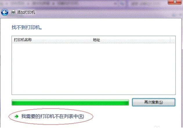 3.系统自动搜索可用的打印机。如果找不到,也可以点击【我需要的打印机不在列表中】,然后点击【下一步】。