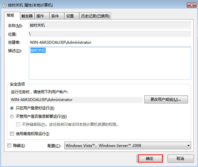 Step10:在弹出的“按时关机 属性“对话框内点击“确定“