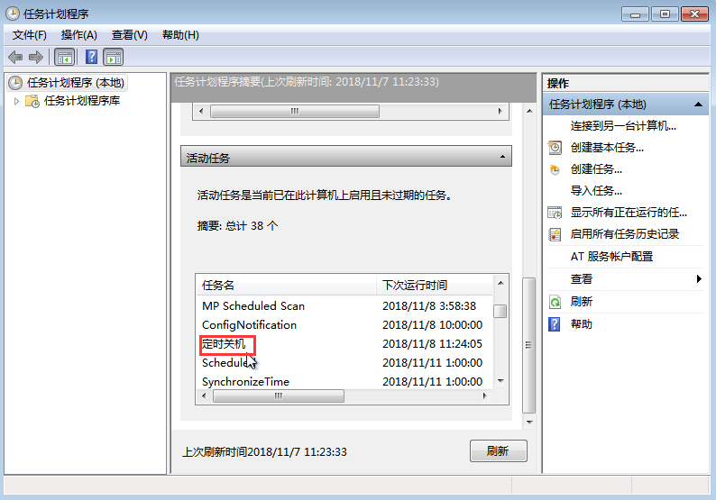 Step11:点击“完成“后就成功设置定时关机了,在”任务计划程序库“中可以找到添加的任务,如果用户想要进行运行、删除等操作时,双击”定时关机“,在弹出窗口右侧的”选项下方“可进行操作