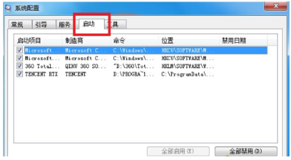 4、然后切换到“启动”选项卡,将多余的启动项即可解决win7重装系统后开机速度慢的问题。