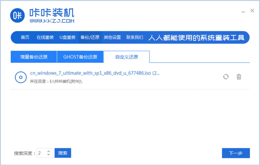 2、在这个界面,点击“自定义还原”,选择刚刚下载的win7旗舰版64位超小系统镜像,点击下一步。