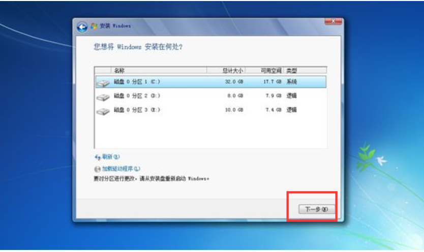 5、我们在磁盘分区界面,选择系统安装位置,然后选择C盘,点击下一步。