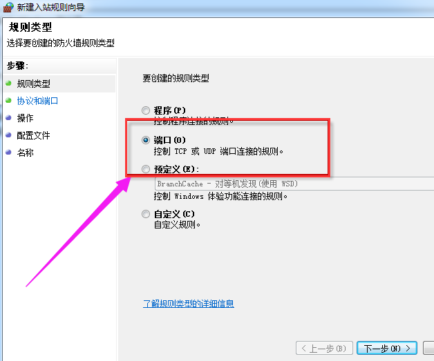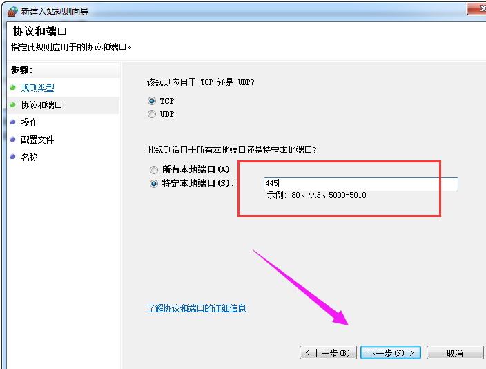 在协议和端口,在特定本地端口框输入“445”,点击下一步