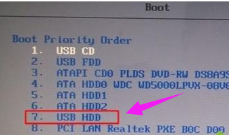 在要重装系统的电脑上插入U盘,启动时按F12等按键,选择usb hdd启动,无法使用快捷键,则进入BIOS设置U盘启动