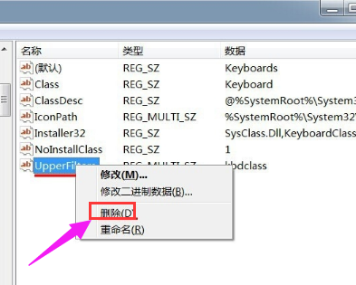 UpperFilters项数值数据(V)为:kbdclass,退出注册表编辑器。