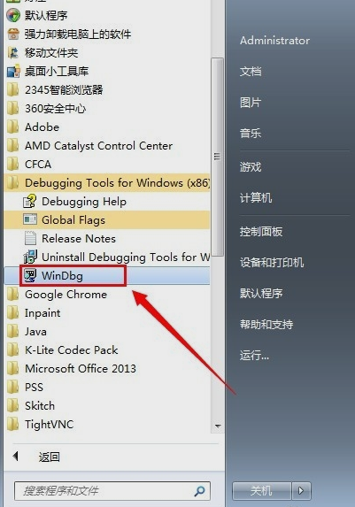 2.安装好了以后,在开始菜单里找得到一个“Debugging Tools for Windows (x86)”,然后再点开找到如下图所示红框框标的“WinDbg”,再点击进入。