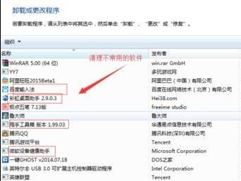 点“开始”菜单,然后再点“控制面板”,再点“程序和功能”,然后选中不常用或者不需要程序。再右键点击卸载。