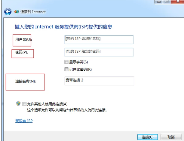 输入正确的宽带连接帐号密码,新连接的名称可以自己设置,开始连接网络。