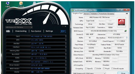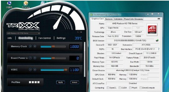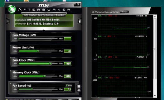 显卡专用超频工具Afterburner超频简单,同样打开窗口一拉就成,而且还支持显卡核心电压调整,超频极为方便。该软件集超频、监控和风扇控制于一身,只要简单的操作即可对显卡进行超频,提升系统性能。运行Afterburner,左边窗口就会显示显卡参数和频率。不过,梅捷HD7750显卡可调整的核心频率、显存频率及核心电压同样被限制在1000、5000MHz和1.1V。