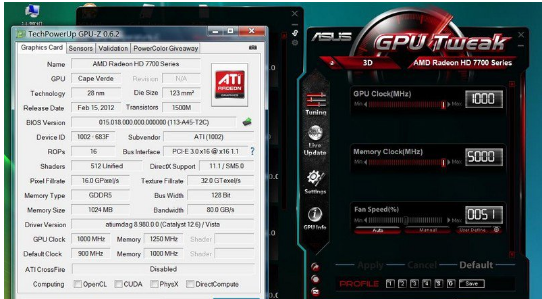 再来看看华硕的GPU Tweak,界面有点类似Afterburner,超频简单,也能保存设置。不过,同样遗憾的是,核心频率和显存频率最高也只能调整到1GHz和5GHz: