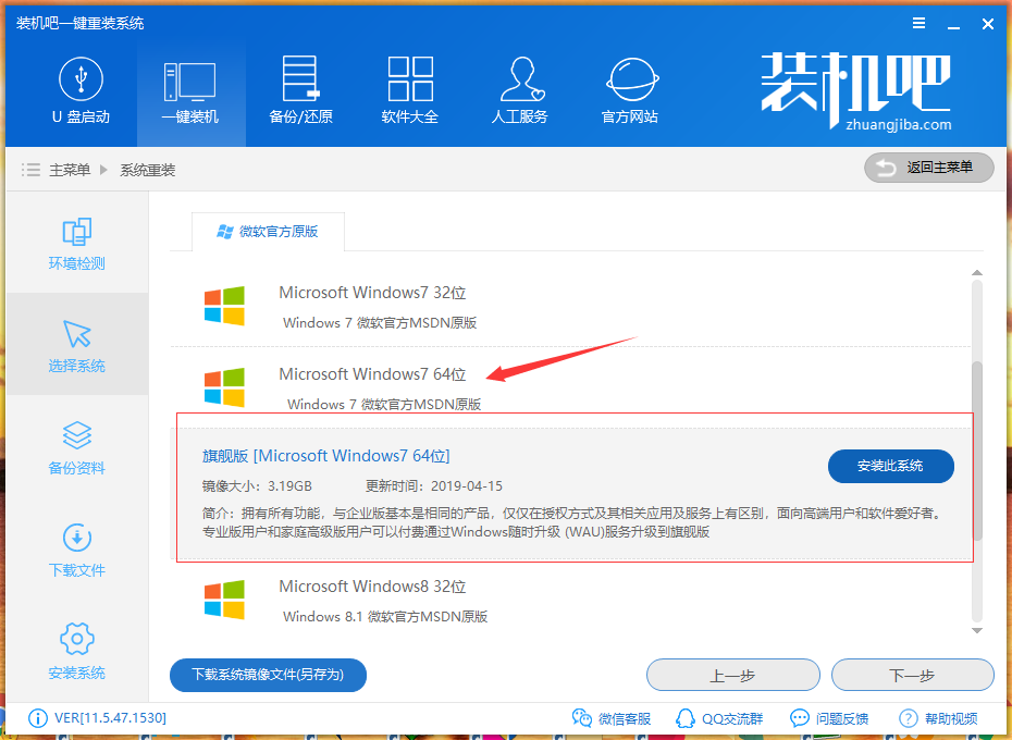 1-3:下一步到选择系统界面,我们直接选择win7系统就可以了,注意这里有64位和32位的区别,如果您的电脑配置不够,建议装32位,否则装64位
