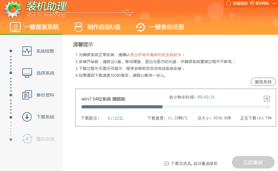 第三步 下载系统。下载用户选择的系统,重装系统的最后一步。到了这一步用户就可以离开电脑,程序会全自动完成重装,为防止出现失败,同时也可以去“制作启动U盘”。