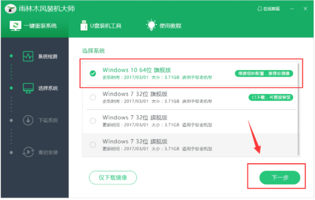 2、接着需要选择安装的系统,建议选择装机大师推荐的系统,然后点击下一步。