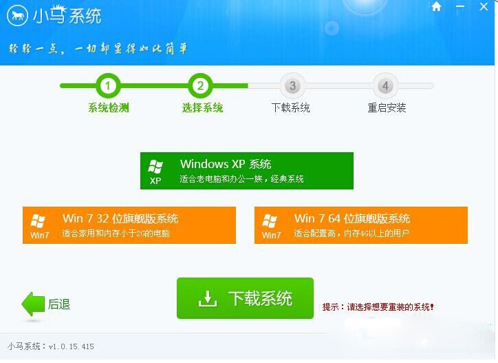 2、进入选择系统界面,选择下载系统,小马为您打造了深度技术、雨林木风、电脑公司、番茄花园、萝卜家园、大地系统等六大品牌系统,用户可根据需求和品牌特性选择一款品牌进行安装。