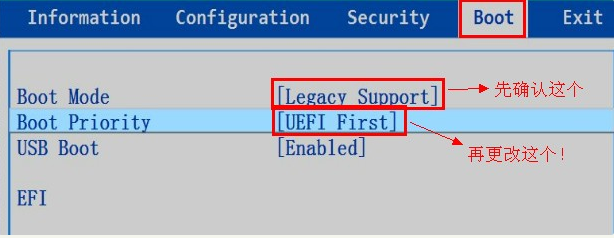 3、接着大家切换到Boot栏目,然后将“Boot Mode”选项里面确认为“Legacy Support”。假如不是的话,大家自己手动选择好。然后移动到“Boot Priority”选项,按回车键将里面的UEFI First”选择更换为这个“Legacy First”。