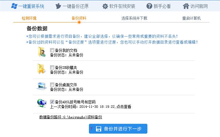 2、点击立即重装系统进入第二步,黑云一键重装系统新版增加数据备份功能,在这里根据自身情况选择备份,提供桌面文件,收藏夹,我的文档,宽带帐号密码四个备份选项。