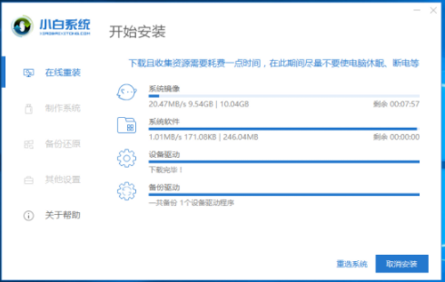 4、下面开始下载系统镜像和系统软件及相关驱动程序,下面的操作都是自动的哦,不需要操作电脑,可以去忙其他的事情。