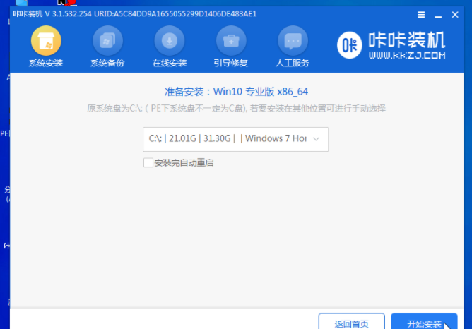 5、在pe系统内,我们打开咔咔装机工具,选择需要安装的系统点击安装即可。