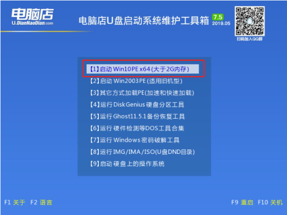 4.将电脑商店u盘的启动盘插入电脑,选择启动或重新启动电脑,当出现开机画面时,快速按下启动快捷键,进入电脑启动项设置界面,选中u盘选项,如图所示,按下回车即可进入电脑店winpe主菜单。