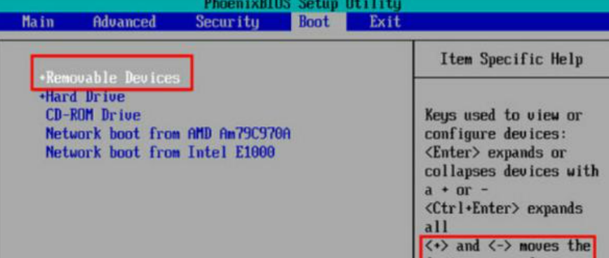3、此时按住【+】键将选项向上移动到页面的第一个位置上,也就是把【removeble devic】移动到最上面,设置为第一启动项,然后按f10保存设置即可。
