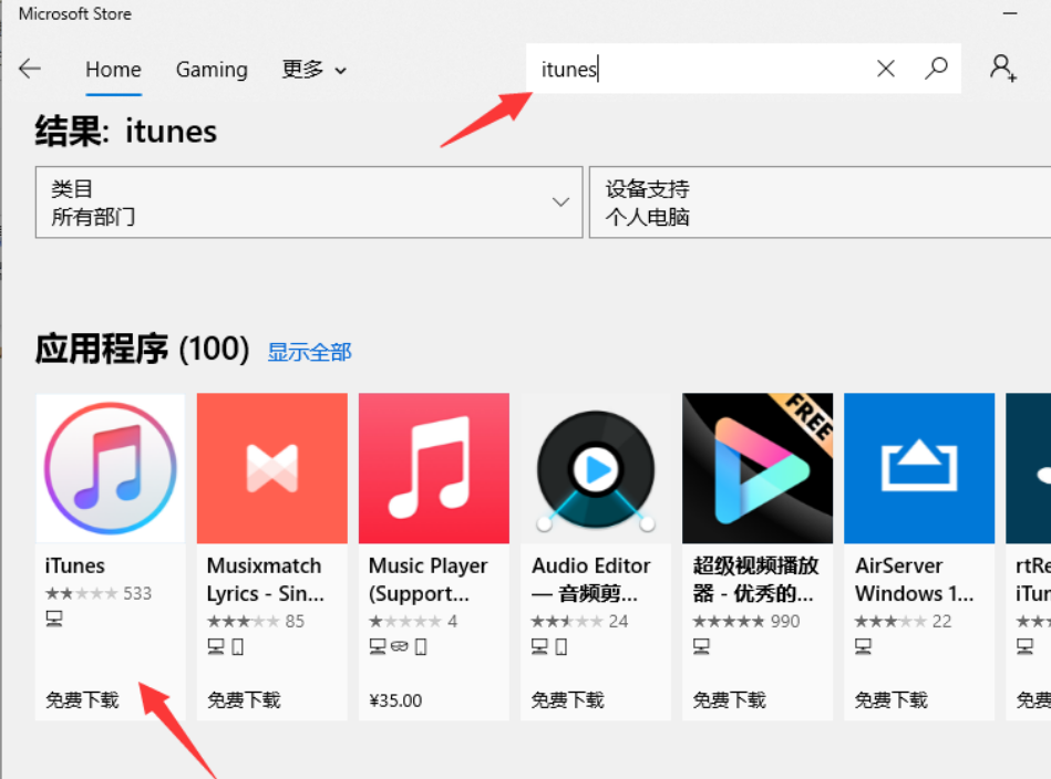 2、在应用商店中输入“iTunes”进行搜索,找到对应的应用打开。