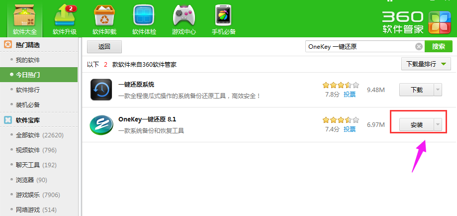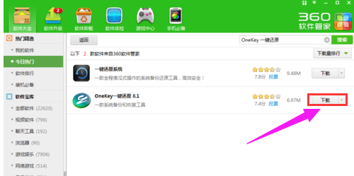 在搜索栏中输入“Onekey一键还原”点击搜索