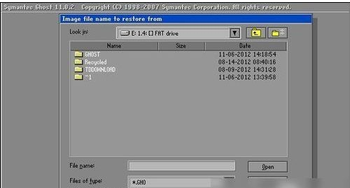 选择刚才备份GHO文件的目录,里面的盘符信息有时候可能会跟我们平时使用的盘符名称有所不同,例如原来的F盘,到了这里可能变成了E盘,在进行选择的时候一定要注意查看是否是想要选择的那个盘符。
