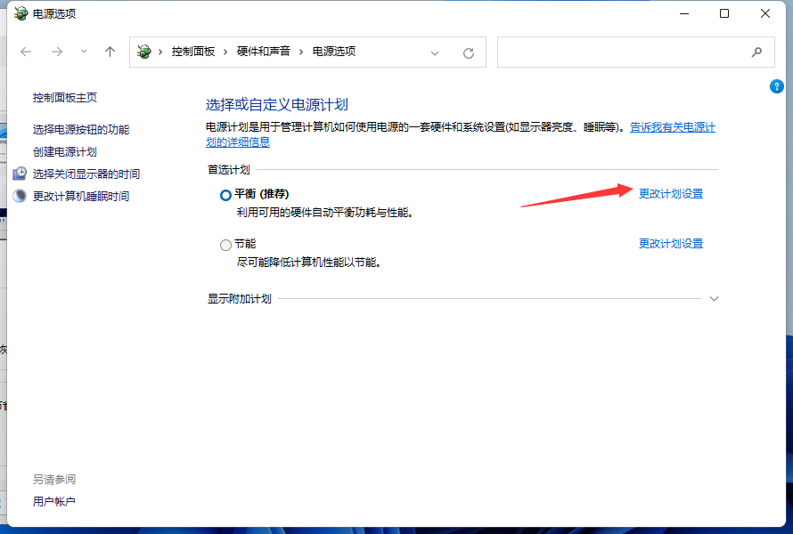 4、进入更改页,在所选的电源计划后面点击更改计划设置。
