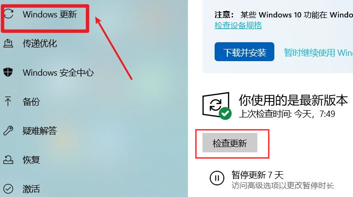 2.进入该页面后,点击左侧的【windows更新】,然后右侧的页面中点击【检查更新】按钮。