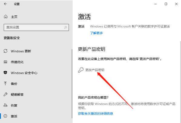 2、我们在进入的页面中选择【激活】,找到【更改密钥】功能。