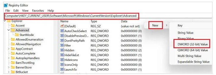 将新的 DWORD(32 位)条目命名为Start_ShowClassicMode,然后按 Enter 键进行保存。